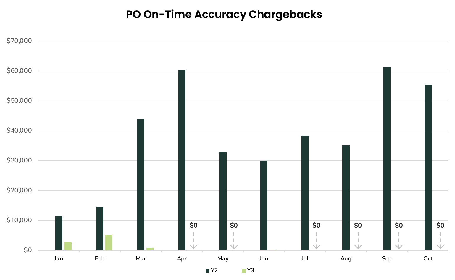 GO manages an HPC brand that was dealing with large chargeback costs from Amazon. The most significant contributor was PO On-Time Accuracy, which made up 55% of the brand’s total chargeback costs in Y1 and 47% of the brand’s total chargeback costs in Y2.