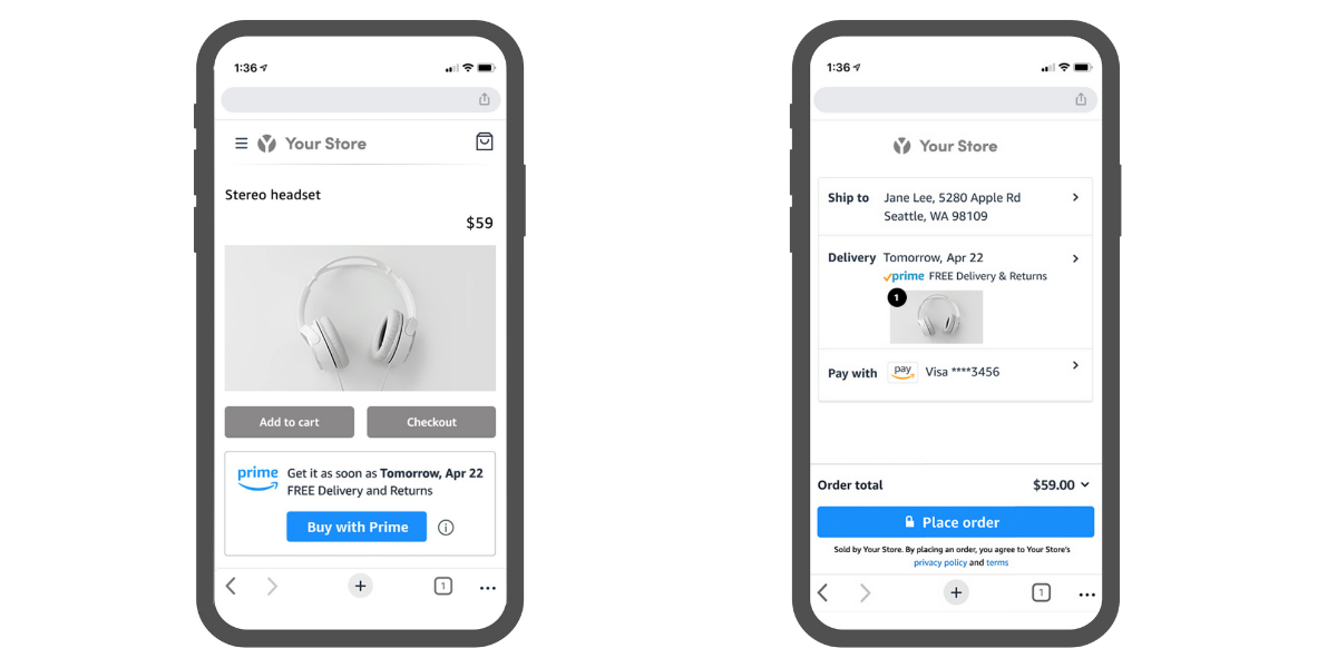 Using Amazon Pay, merchants can provide a seamless Buy with Prime checkout experience offering Amazon Prime members a fast, familiar way to pay using the shipping and payment information from their Amazon account. After installing the Buy with Prime button code in their online store, merchants can easily add Buy with Prime to one or more products.