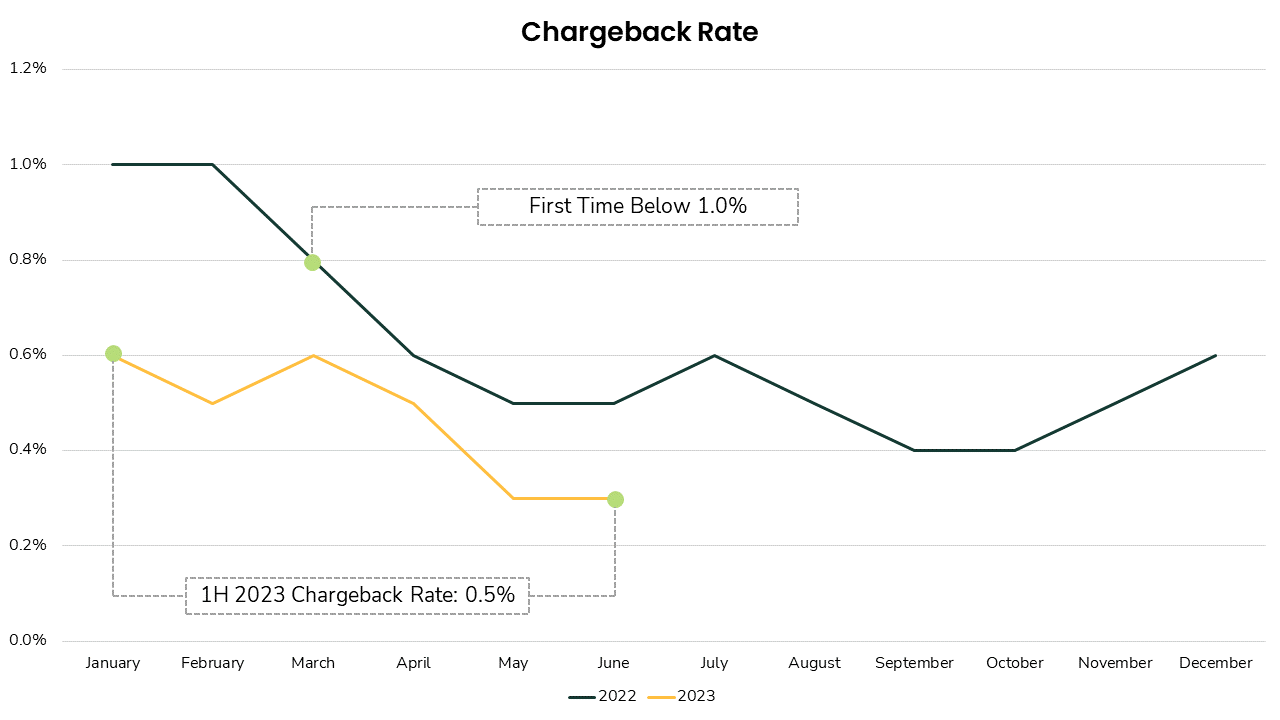 Our next goal was to dig into smaller chargeback issues to drive this metric closer to 0%. The major chargeback costs had already been addressed for most of our clients, so it was just a matter of solving some of the less impactful problems. Thanks to this more nuanced work, we accomplished a 0.5% total chargeback rate in the first half of ‘23.