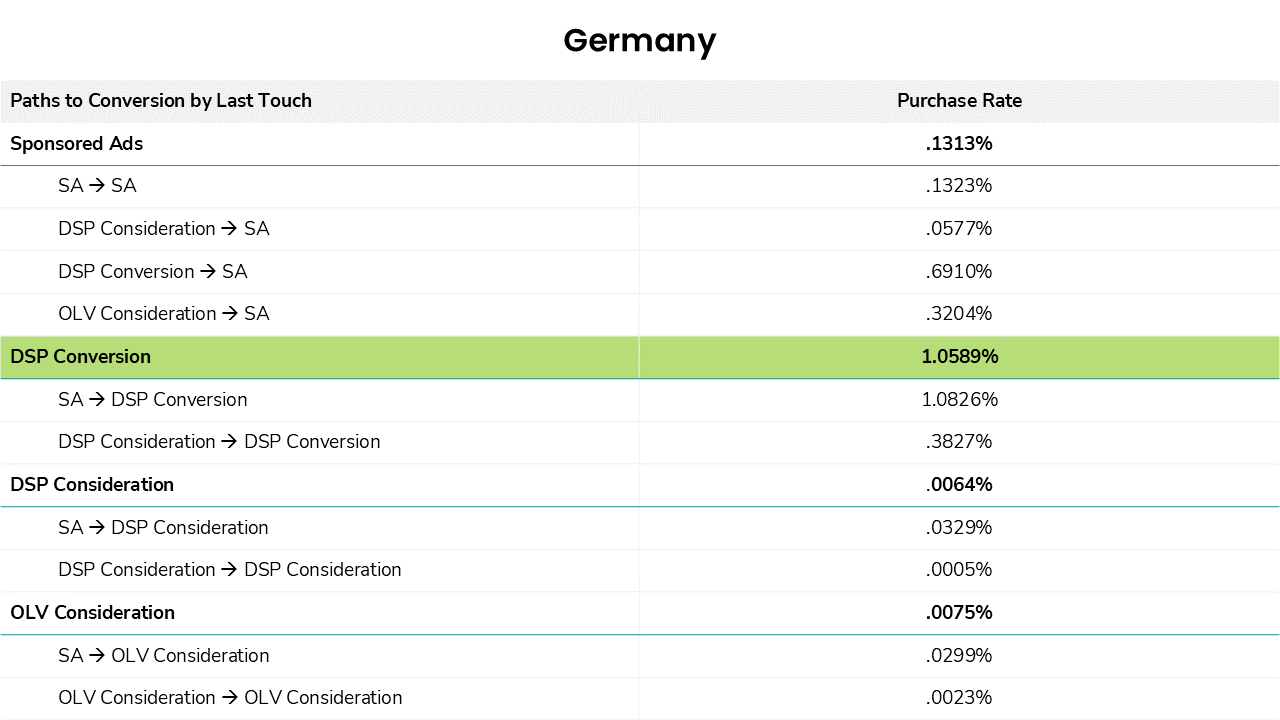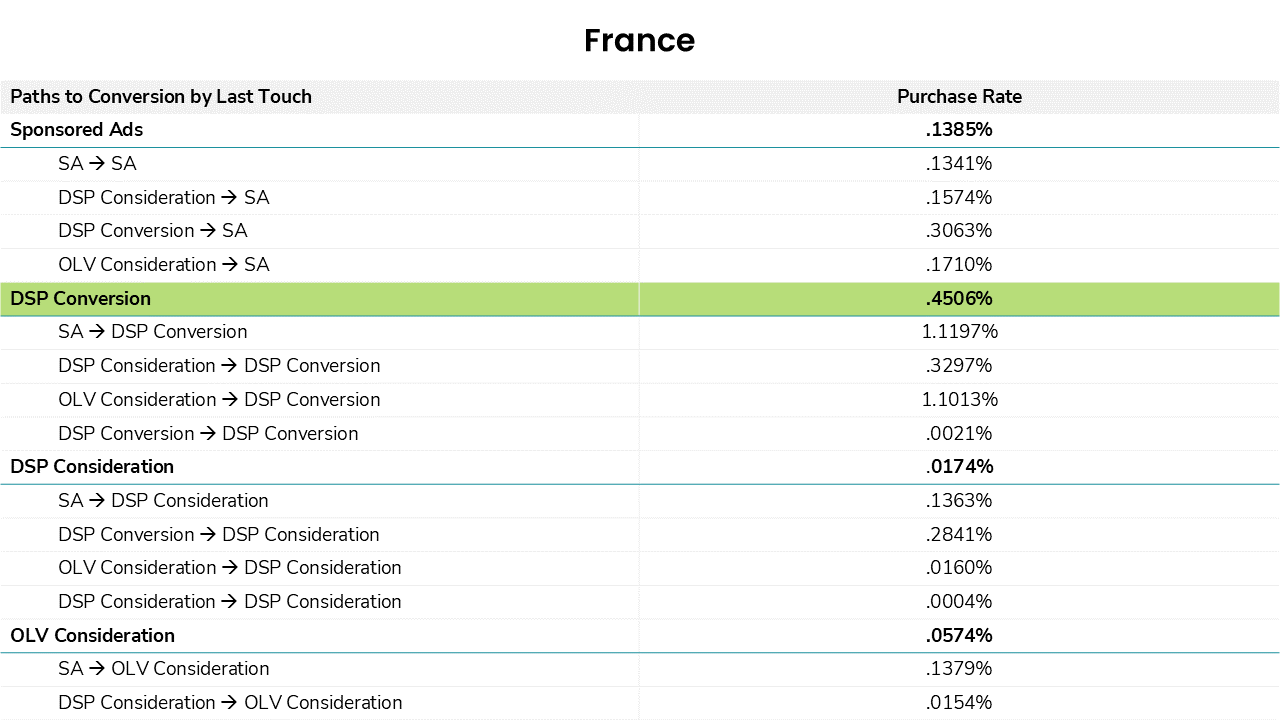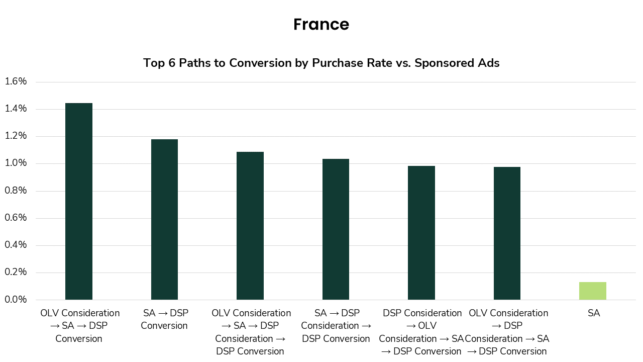 Top paths to conversion across FR & DE that included DSP and/or OLV showed 4X – 6X higher purchase rates than a Sponsored Ads-only path to conversion.